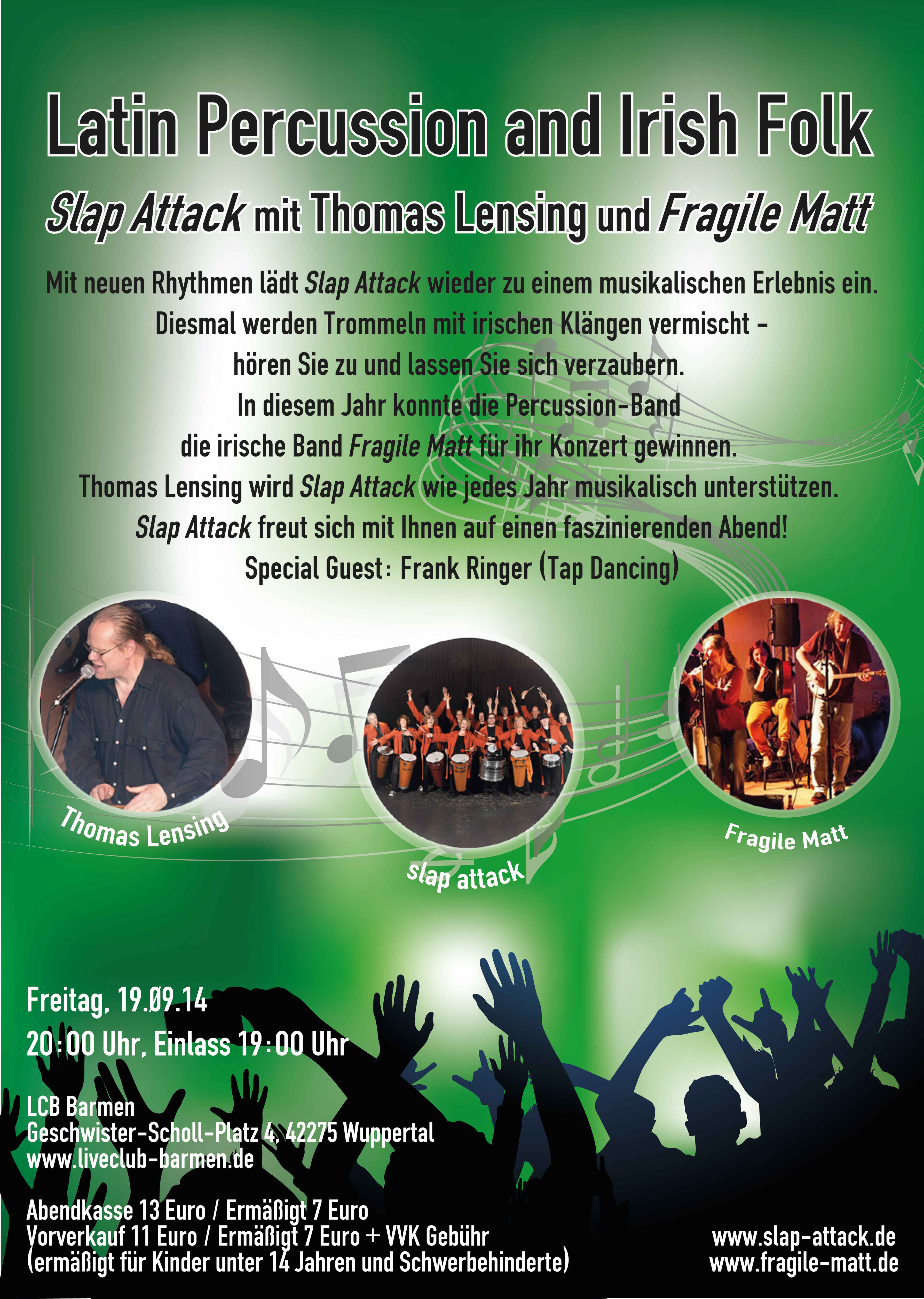 "Latin Percussion meets Irish Folk": Konzert mit Slap Attack & Fragile Matt Tickets jetzt nur noch per Reservierung an der Abendkasse: Tel. 0202 / 64 30 64. (Die VVK-Karten sind schon weg!) Plakat und Flyer zur Veranstaltung. Video-Impressionen (aus dem Konzert vom 19.09.14 im LCB) |